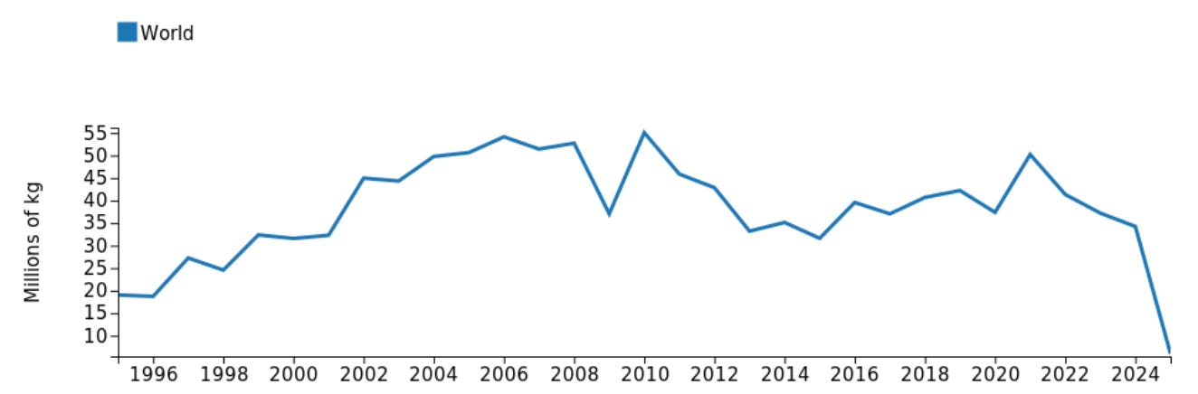 Exportaciones chinas de antimonio, 1995-2025, fuente: Sistema de Información de Planificación de Exportaciones, a través de Pricepedia.