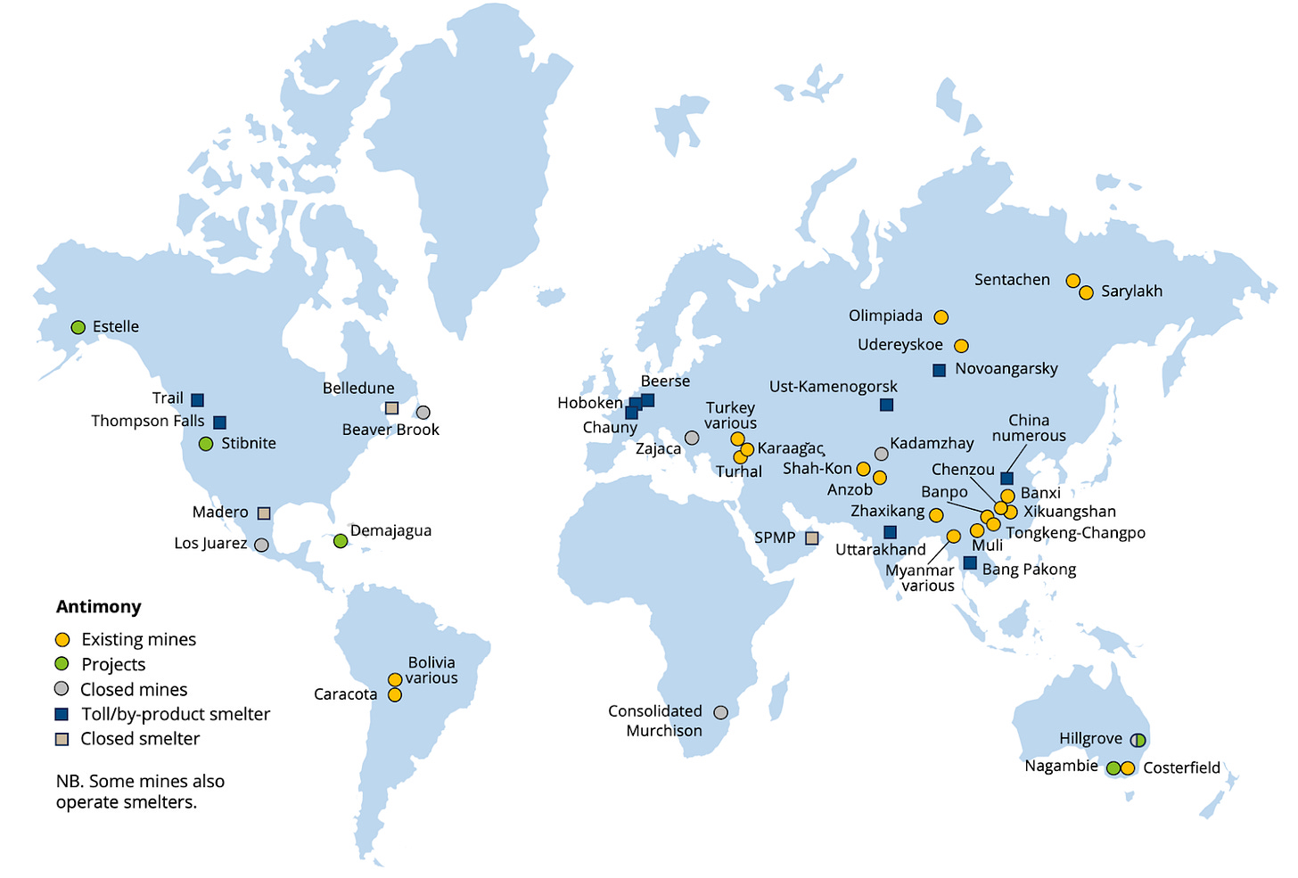 Actualmente, China, Rusia y Tayikistán controlan alrededor del 90 % de la producción mundial de antimonio de mina.