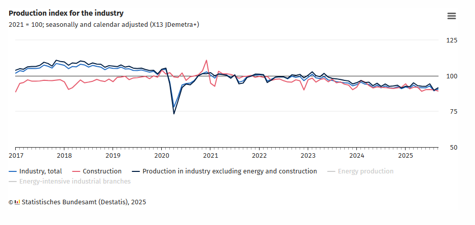 La producción industrial española aumentó un 1,7 % interanual en septiembre de 2025, tras un aumento revisado a la baja del 3,3 % en el mes anterior. La producción industrial italiana cayó un 2,4 % intermensual en agosto, peor de lo que esperaba el mercado, que pronosticaba un descenso del 0,4 %.