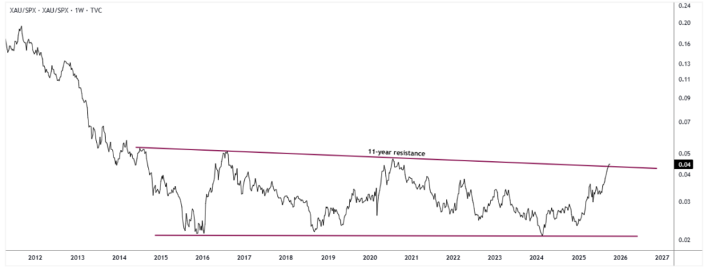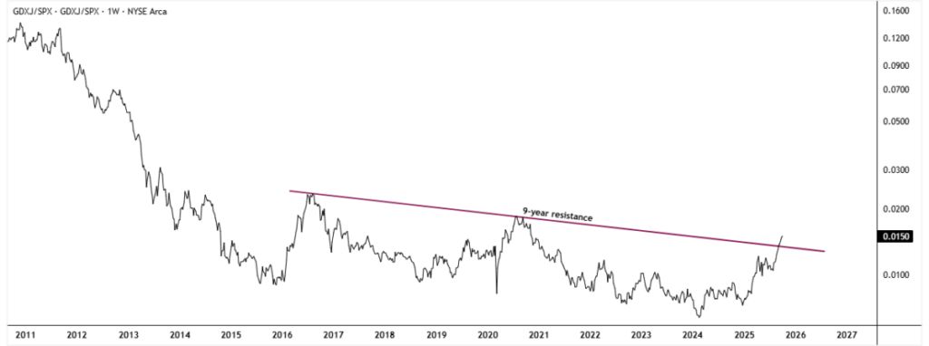 La última pieza de este rompecabezas de rotación encajó a mediados de septiembre de 2025, cuando la relación GDXJ/SPX, mineras de oro junior frente al S&P 500, superó su propia línea de tendencia descendente de nueve años. Tras las rupturas confirmadas en XAU/SPX y SIL/SPX, este movimiento completó el panorama de un resurgimiento en todo el sector, confirmando que la fortaleza de las mineras de metales preciosos se está extendiendo a todos los niveles del complejo.