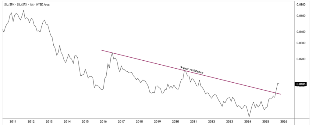 Si el XAU/SPX representa la base estructural de esta rotación, entonces el SIL/SPX —mineras de plata frente al S&P 500— marca su aceleración inicial. A principios de agosto de 2025, la relación superó una línea de tendencia descendente de nueve años, registrando su primera señal de reversión confirmada desde 2016 y indicando que el impulso comenzaba a desplazarse de manera decisiva hacia el lado de alto beta del complejo de metales.