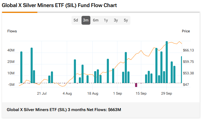 La configuración técnica por sí sola ya sería digna de mención, pero lo que hace que este movimiento sea aún más convincente es la confirmación de los flujos de capital. En los últimos tres meses, el ETF Global X Silver Miners (SIL) ha absorbido 663 millones de dólares en entradas netas, su mayor aportación trimestral en años. Esos flujos comenzaron casi exactamente cuando la ratio superó su tendencia bajista en agosto, un momento demasiado preciso como para descartarlo como una coincidencia.