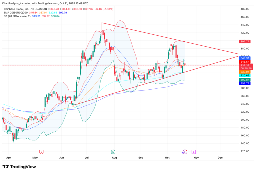 En el gráfico diario, COIN se está consolidando dentro de un patrón triangular simétrico, con una resistencia que se forma cerca de los 397 dólares y un soporte en torno a los 300 dólares.