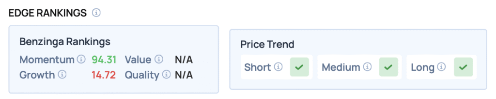 Clasificación de Benzinga Edge: Según la clasificación de Benzinga Edge, la acción cuenta con una alta puntuación de impulso de 94,31, pero obtiene una puntuación baja en crecimiento, con 14,72.