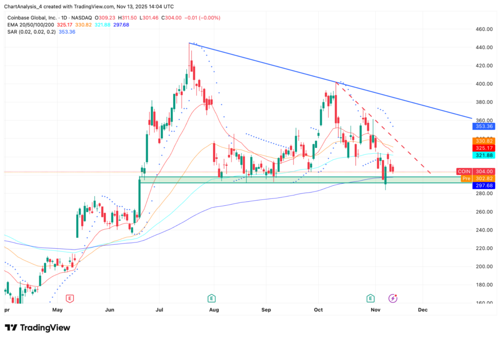 Las acciones de Coinbase cotizan cerca de los 300 dólares, estabilizándose en torno a su media móvil exponencial (EMA) de 200 días en 297 dólares tras repetidas pruebas desde julio.