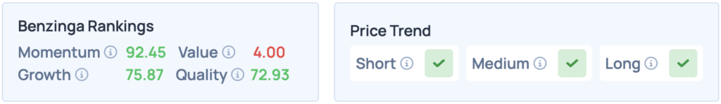 Según Benzinga Edge Stock Rankings, TSLA obtiene una puntuación alta, con una tendencia de precios favorable a corto, medio y largo plazo. Haz clic aquí para obtener información más detallada sobre la acción, sus homólogas y sus competidores.